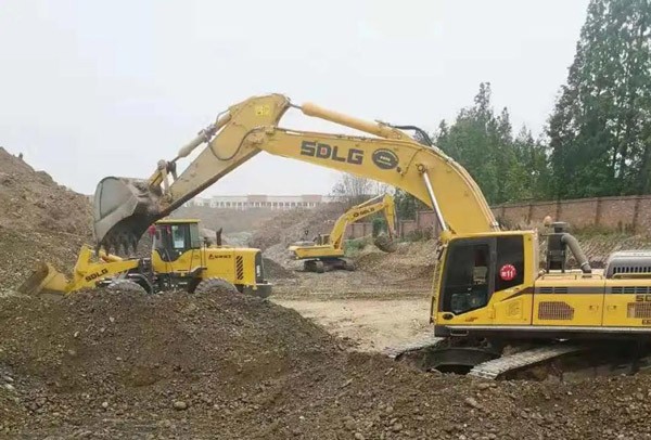 在成都某大型工地上,多台山东临工挖掘机正在繁忙施工中,E6360F、E6400F PLUS、E6500F,几乎囊括了山东临工所有的大吨位挖掘机。