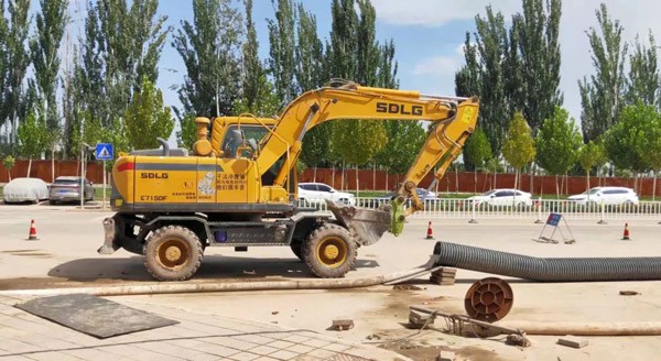 在新疆喀什某市政项目施工现场,吴老板驾驶着他心爱的山东临工E7150F轮式挖掘机,正在进行挖掘沟渠作业。