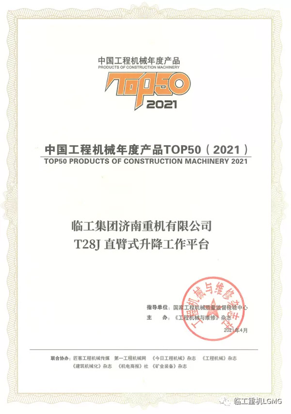 集团新闻 |临工重机T28J直臂式升降工作平台荣获2021中国工程机械TOP50奖