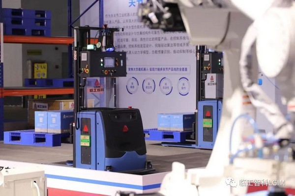 临工智科多方位的展示了关节机器人、无人叉车、AMR的作业场景